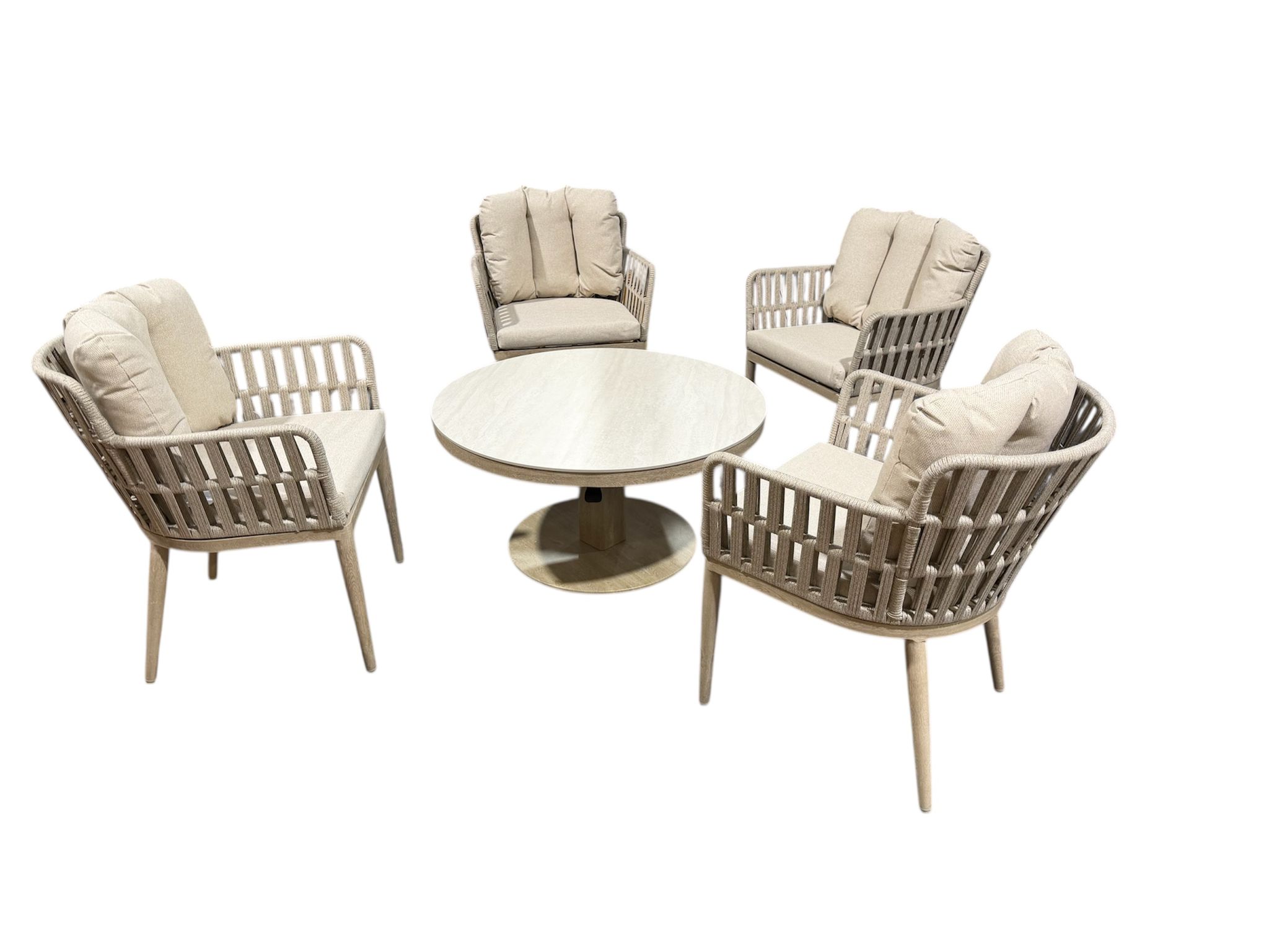 The Samoa 4 Seater Set is a beautifully balanced blend of modern design and relaxed outdoor comfort, ideal for more intimate garden or patio spaces. Comprising two stylish armchairs and a perfectly proportioned round bistro table, this set features softly curved frames and refined rope-effect detailing that adds texture and a contemporary edge. The plush, neutral cushions provide excellent comfort and support, making it an inviting spot for morning coffee, light meals, or quiet moments outdoors.